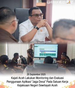 WWW.INDONESIACERDASNEWS.COM || Kejati Aceh — Kepala Kejaksaan Tinggi Aceh, Yudi Triadi, S.H., M.H., melakukan monitoring dan evaluasi terhadap penggunaan aplikasi “Jaga Desa” pada satuan Kerja Sewilayah Aceh di ruang rapat Kajati Aceh, Senin (29/09/2025). Kegiatan tersebut dilakukan untuk memastikan jajaran bidang intelijen Kejati Aceh dan Bidang Intelijen Kejaksaan Negeri Sewilayah Aceh telah mengoptimalkan penggunaan Aplikasi […]
